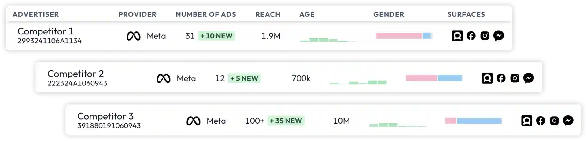 - Observe Platform Prioritization: See how their presence across different Meta surfaces (Facebook Feed, Instagram Feed, Stories, etc.) evolves, revealing where they are focusing their efforts.